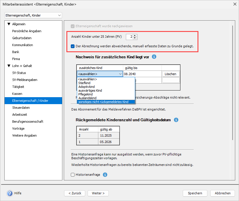 Wenn Ihnen die Daten nicht vorliegen, erfassen Sie die Elterneigenschaft / Anzahl Kinder anhand von geeigneten Nachweisen des Arbeitnehmers.