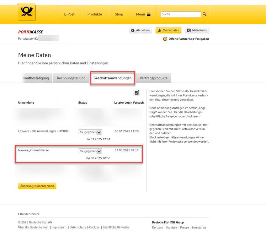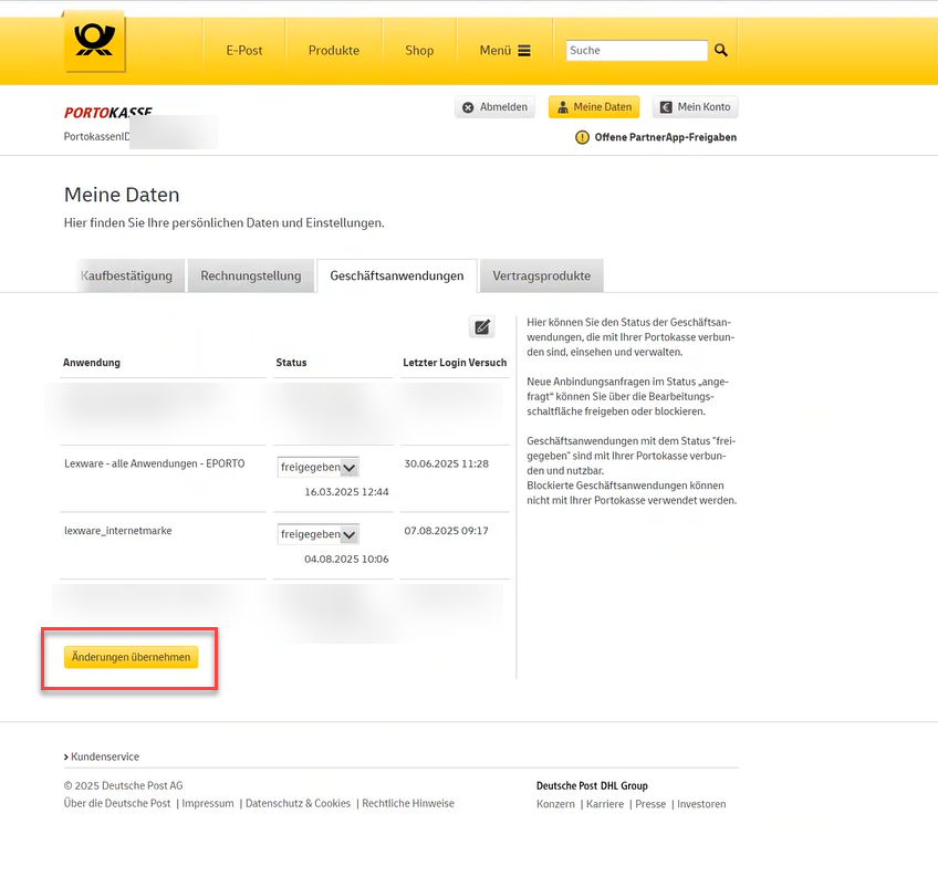 1. Loggen Sie sich online in Ihr Kundenkonto der Portokasse der Deutschen Post ein. Im Anschluss finden Sie direkt eine Schaltfläche auf der Startseite, über die Sie an die richtige Stelle geleitet werden (manueller Klickpfad: Meine Daten - Geschäftsanwendungen):