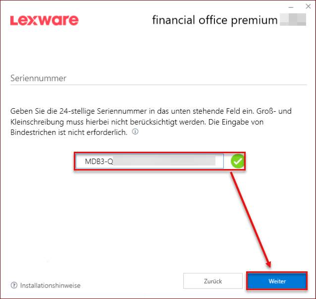 - Geben Sie Ihre Seriennummer ein. Klicken Sie auf 'Weiter'.