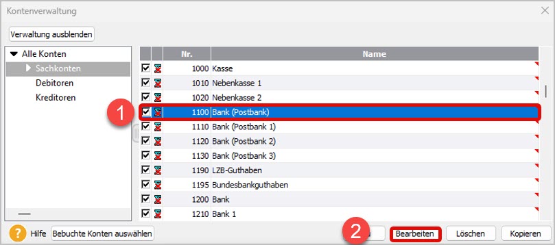 Verwaltung - Kontenverwaltung. - Markieren Sie das gewünschte Konto für die Onlinebanking-Synchronisierung (1).