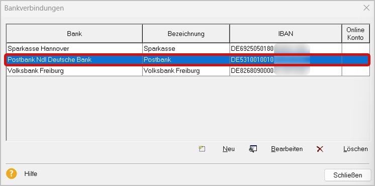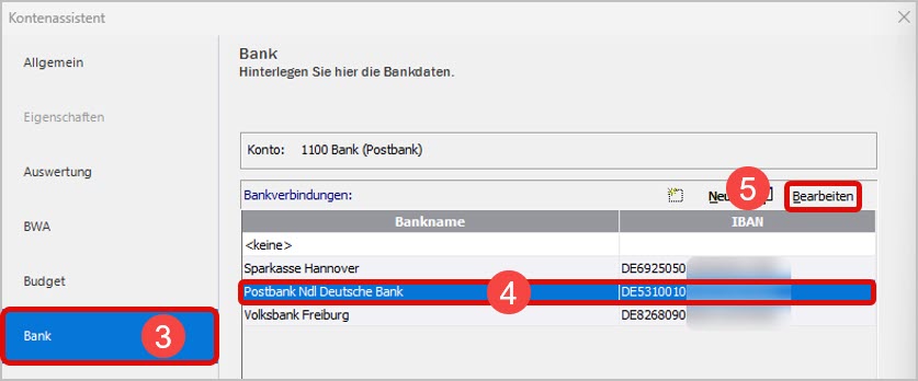 - Wählen Sie die Bankverbindung aus, die Sie neu einrichten möchten (4).