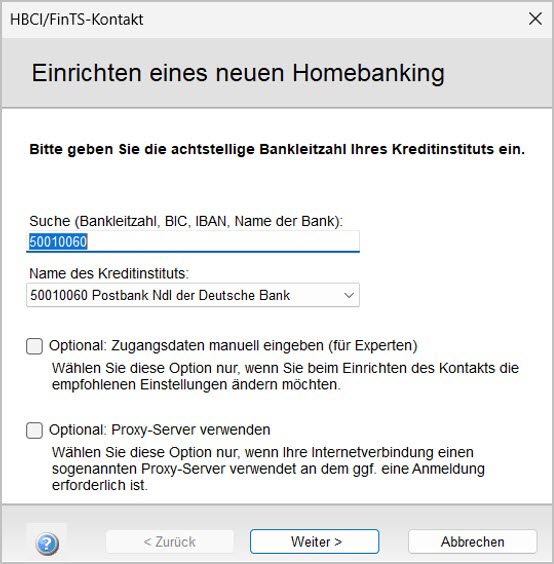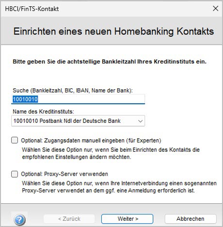 Einrichten eines neuen HBCI-Kontaktsöffnet sich.