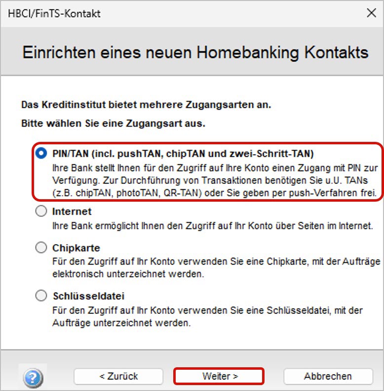 PIN/TAN(inkl. Push-TAN, Photo-TAN, SMS-TAN, Chip-TAN und andere 2-Schritt-Verfahren)Chipkarte(physische Chipkarte mit USB-Kartenlesegerät)Schlüsseldatei(HBCI-Keyfile)- Hinweis: Die Zugangsart