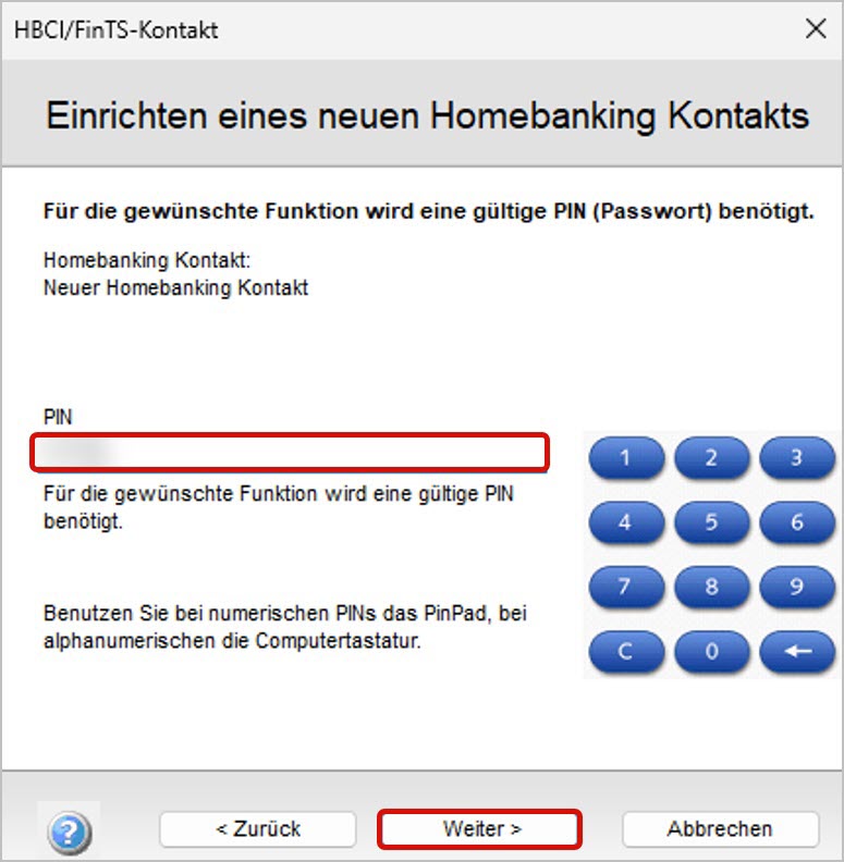 PINbzw. IhrPasswortfür den HBCI-Zugang ein. Dies ist in der Regel das gleiche Passwort, das Sie für die Webseite Ihrer Bank verwenden.
