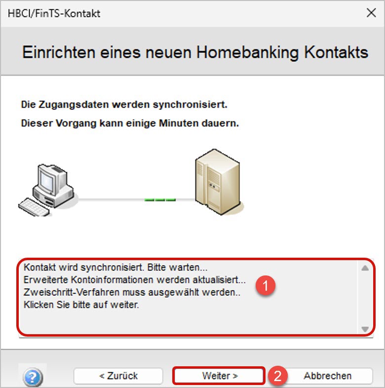 - Geben Sie Ihre von der Bank erhaltenen HBCI-Zugangsdaten ein (1+2).