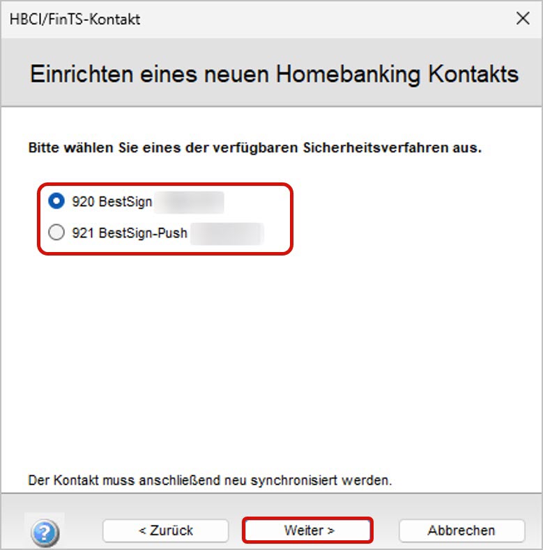 Online(2). - Ein Auswahldialog des HBCI-Kontaktassistenten öffnet sich.