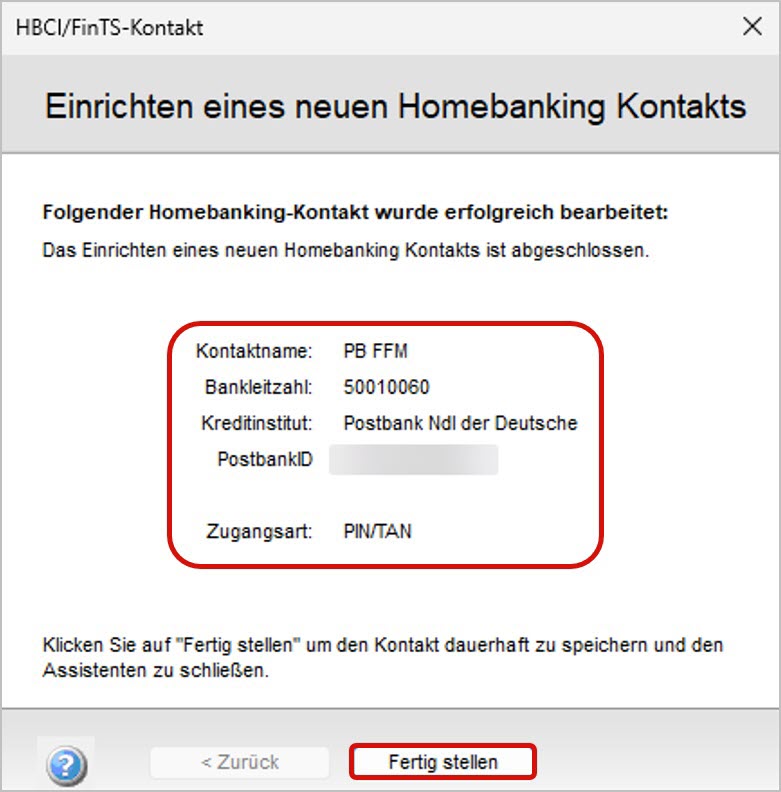- Sie erhalten eine Zusammenfassung des erfolgreich eingerichteten HBCI-Kontakts.
