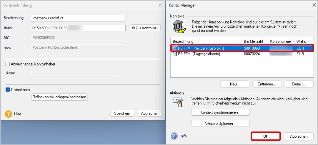 - Konto im HBCI-Kontaktmanager mit dem Programm verknüpfen:
