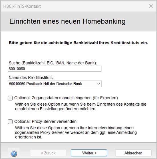 Einrichten eines neuen HBCI-Kontaktsöffnet sich.