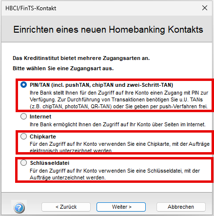 PIN/TAN(inkl. Push-TAN, Photo-TAN, SMS-TAN, Chip-TAN und andere 2-Schritt-Verfahren)Chipkarte(physische Chipkarte mit USB-Kartenlesegerät)Schlüsseldatei(HBCI-Keyfile)- Hinweis: Die Zugangsart
