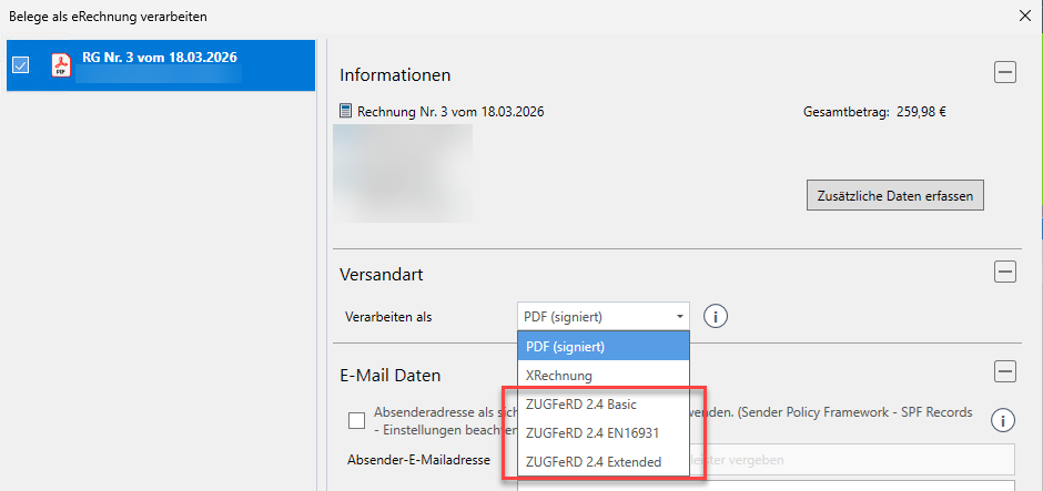 Ihr Versandprozess bleibt unverändert. Das Versandformat ZUGFeRD 2.4 wird im Feld 'Versandart' des 'Versand-Dialogs' angezeigt: