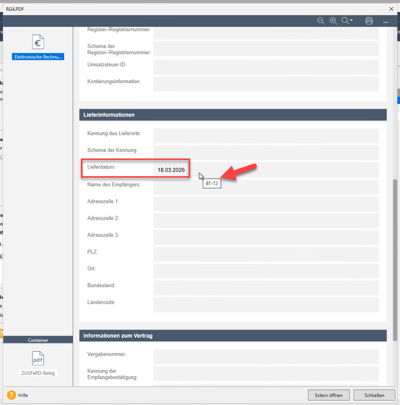 Das Feld 'Lieferdatum' wird in der ZUGFeRD Version 2.4 zum Pflichtfeld. Es wird im XML der E-Rechnung im Feld BT-72 übertragen.