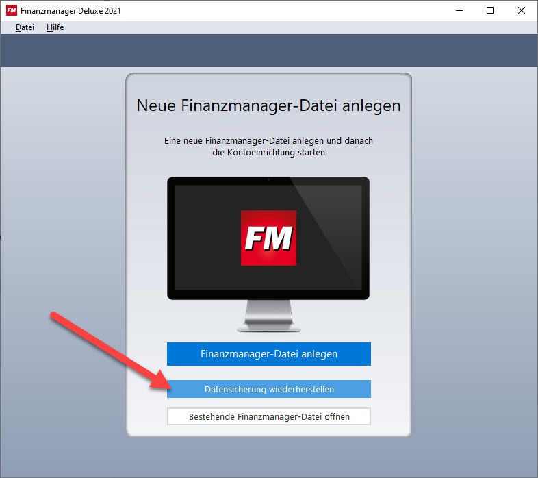 Drücken und halten Sie die STRG-Taste und starten Sie FinanzManager durch Doppelklick auf das Programm-Icon. Er startet dadurch, ohne eine Datenbank zu laden (wenn das nicht gelingt, brechen Sie das Laden der Datenbank während des Starts ab):