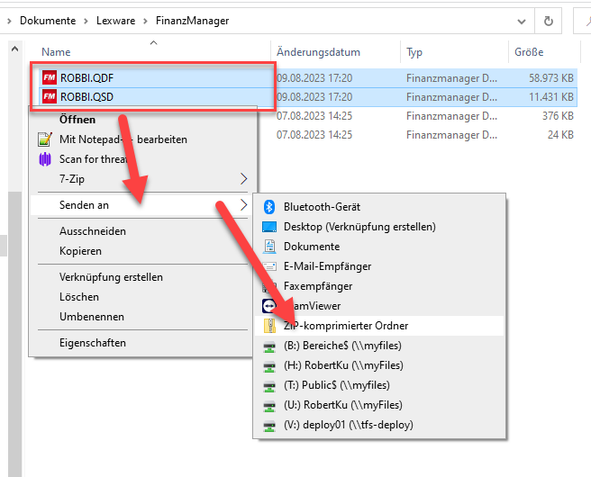 Navigieren Sie zu diesem Ordner, markieren Sie die beiden Dateien mit Klick bzw. STRG+Klick. Klicken Sie anschließend mit der rechten Maustaste auf die beiden markierten Dateien und wählen Sie aus dem Kontextmenü "Senden an" - "ZIP-komprimierter Ordner":