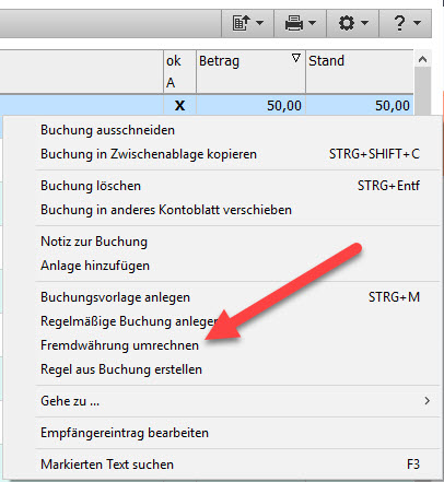 Wechseln Sie in ein Fremdwährungskonto und klicken Sie mit der rechten Maustaste auf eine Buchung.