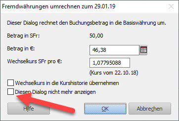 Entfernen Sie das Häkchen bei 'Diesen Dialog nicht mehr anzeigen' und passen Sie ggf. die Übernahmeoption für die Kurshistorie an (der Umrechnungskurs pro Buchung wird sowieso gespeichert, es geht nur um die Historie), verlassen Sie anschließend diesen Dialog mit 'OK'.