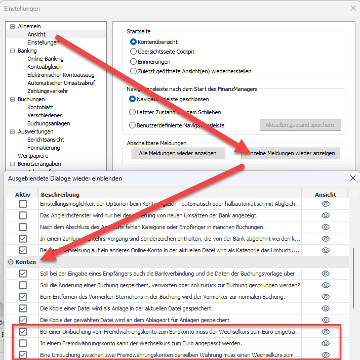 Ab FinanzManager 2026 können Sie die Meldung unter F11 (Einstellungen) - Allgemein - Ansicht: