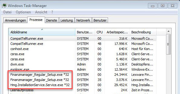 Prüfen Sie, ob der Lexware-Installations-Prozess im Taskmanager angezeigt wird
