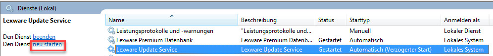 Die Dienstübersicht wird gestartet. - Suchen Sie in der Dienstübersicht nach 'Lexware Update Service'.