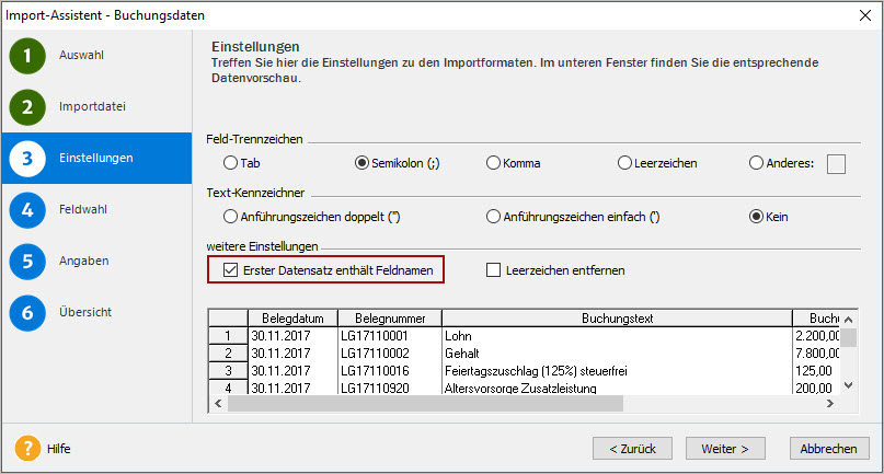 - Aktivieren Sie die Einstellung 'Erster Datensatz enthält Feldnamen'.