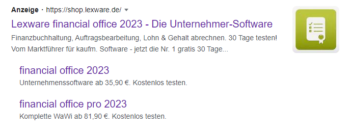 Screen einer Google Ergebnisseite mit Google Ad von Lexware financial office