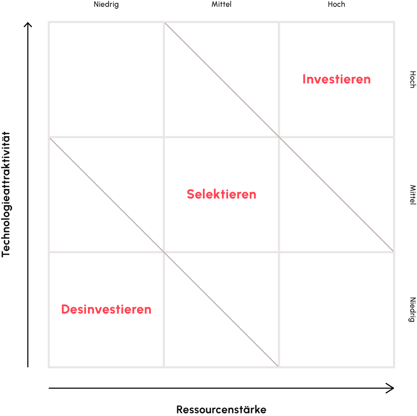 Ähnlich wie bei den anderen Portfoliomodellen wird bei der Technologie-Portfolioanalyse eine 9-Felder-Matrix verwendet, in der die Technologieattraktivität und die Ressourcenstärke analysiert werden. Unternehmen können auf Basis dieser Analyse Investitionsstrategien, Selektionsstrategien oder Desinvestitionsstrategien entwickeln.
