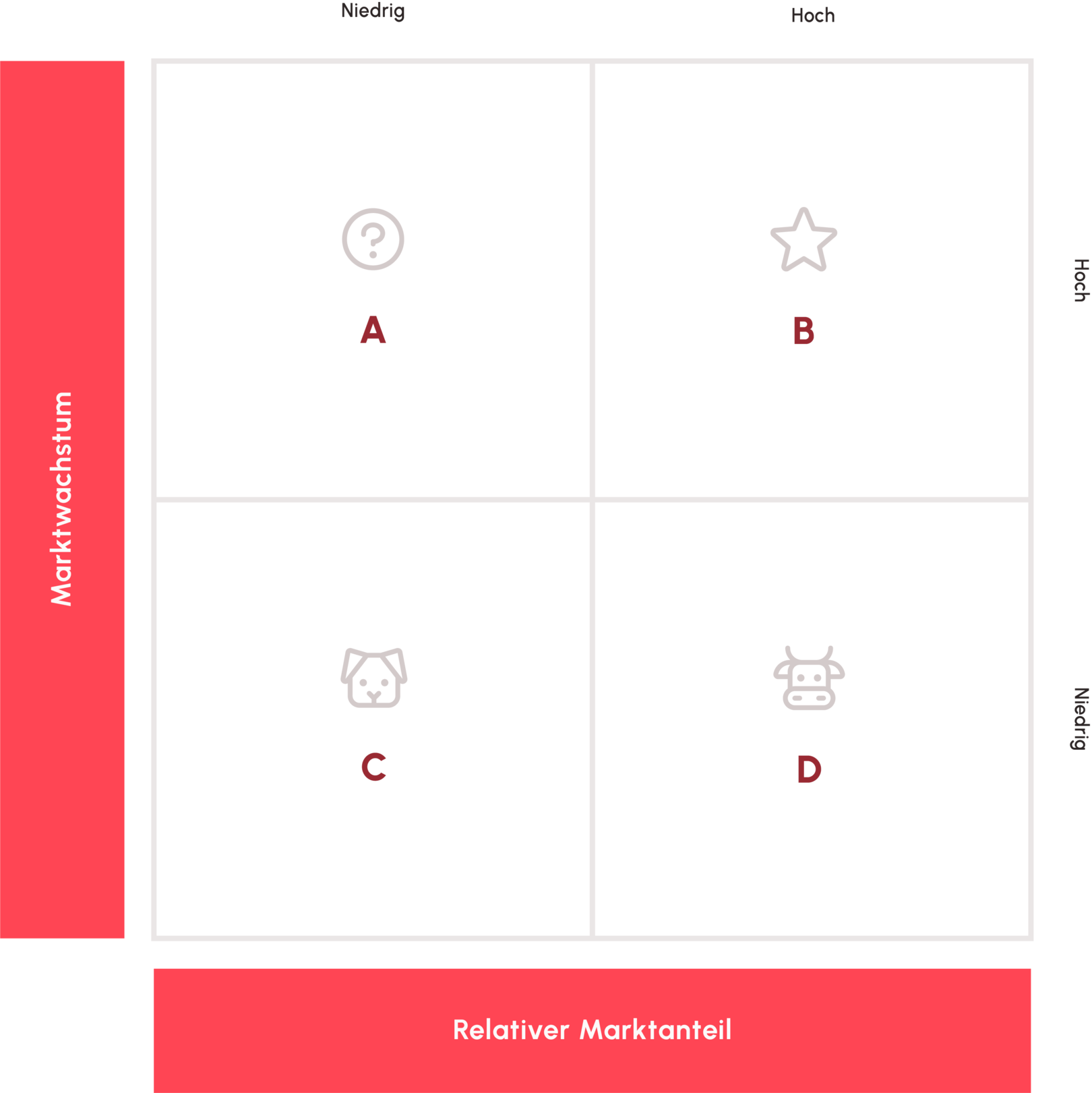 Die klassische 4-Felder-Matrix unterteilt die strategischen Geschäftsfelder in vier Quadranten, die unterschiedliche strategische Positionen abbilden.